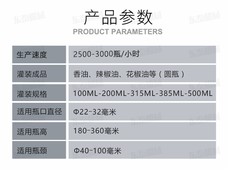 灌裝機(jī)簡(jiǎn)述 該系列灌裝機(jī)采用容積式計(jì)量灌裝原理,適用于各種規(guī)(100ml-1000ml)的南瓜籽油、榛子油、牡丹籽油、芝麻油、核桃油、山茶油、亞麻籽油、棉籽油、橄欖油、大豆油、玉米油