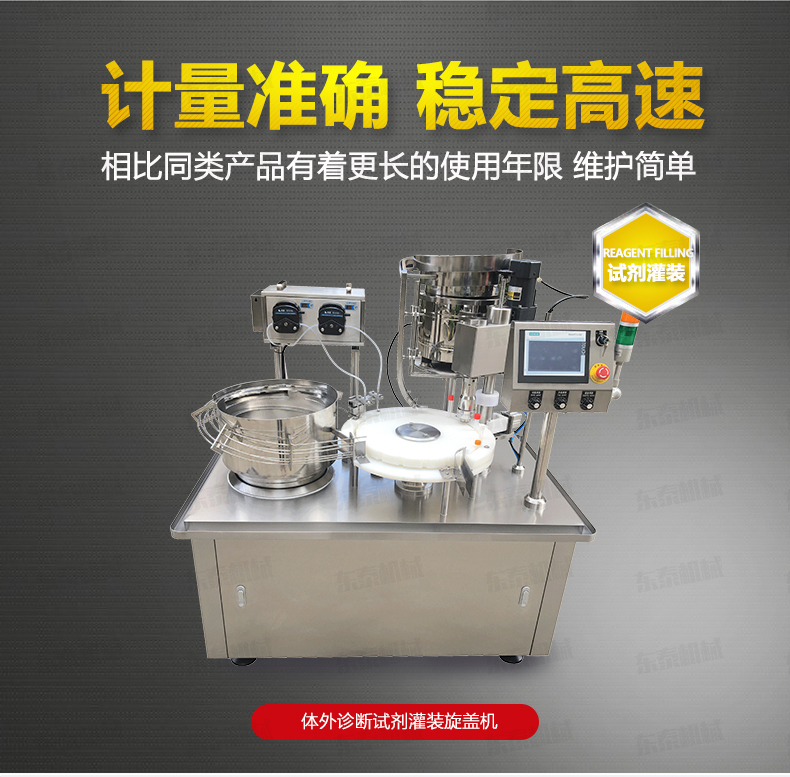 設(shè)備簡介: 本機(jī)是在引進(jìn)和吸收國外技術(shù)的基礎(chǔ)上,由我公司自主研發(fā)的一款I(lǐng)VD診斷試劑灌裝旋蓋一體機(jī),能同時完成自動理瓶、自動上瓶、定量灌裝、自動理蓋、上蓋和旋蓋封口等動作。本機(jī)采用日本高