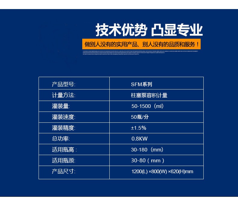 產(chǎn)品簡(jiǎn)介:半自動(dòng)醬類醬料灌裝機(jī)SFM系列結(jié)構(gòu)合理、機(jī)型小巧、性能可靠、定量準(zhǔn)確、操作方便。整機(jī)304不銹鋼,灌裝悶頭防漏料防滴油,氣缸驅(qū)動(dòng)結(jié)構(gòu),加大200L料斗,品牌全鋁殼銅芯大功率攪拌電機(jī),變頻調(diào)速,PLC智能控制,用戶可根據(jù)需要任意調(diào)節(jié)灌裝量及灌裝速度,灌裝精度高。