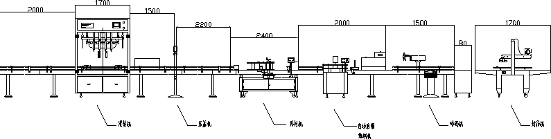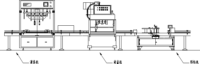 方案設(shè)計一:灌裝機+壓蓋機+貼標機+自動膠帽熱縮機+噴碼機+封箱機