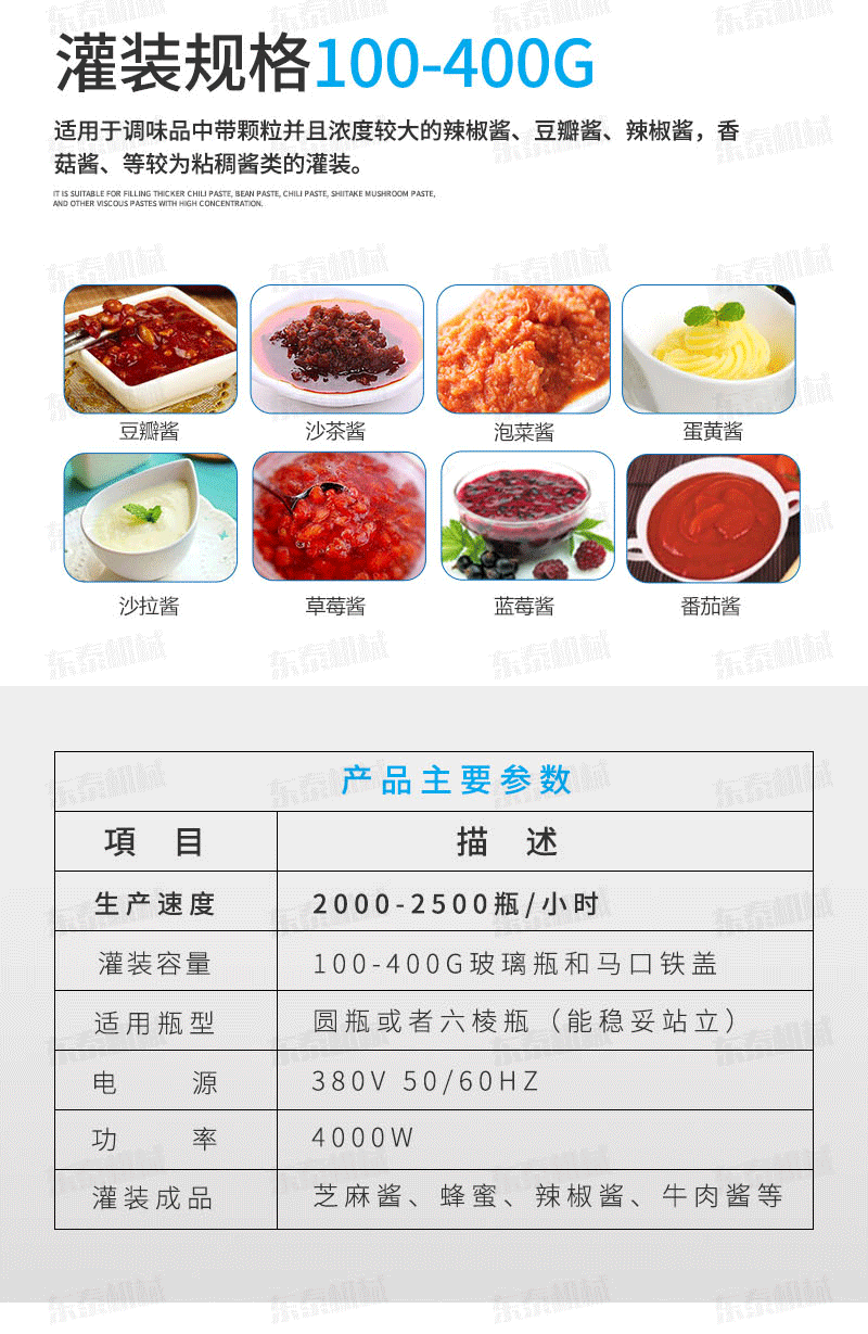 目前我們公司身為國(guó)內(nèi)的辣椒醬灌裝機(jī)廠家在國(guó)內(nèi)屬于比較專業(yè)的,辣椒醬灌裝機(jī)設(shè)備價(jià)格不僅是有著優(yōu)勢(shì)而且不管是設(shè)計(jì)理念和外觀模型都已經(jīng)與國(guó)際接軌,可以說正是因?yàn)樵摍C(jī)的出現(xiàn)才能夠解決了一些醬料廠家遇難的難題和困難,全套辣椒醬灌裝機(jī)機(jī)械廠家已經(jīng)是對(duì)設(shè)備從外觀設(shè)計(jì)與以往的設(shè)計(jì)方式完全的不同,變得簡(jiǎn)潔大方,并且是我們進(jìn)行了一些部分附加功能,主要用于一些油料產(chǎn)品的灌裝,能完成自動(dòng)上料、自動(dòng)計(jì)量、自動(dòng)灌裝、和自動(dòng)輸送等功能,可以看到更加的自動(dòng)化了,因此對(duì)于我們這款辣椒醬灌裝機(jī)價(jià)格可以前來我們東泰公司,將會(huì)給你個(gè)合理的價(jià)格的。